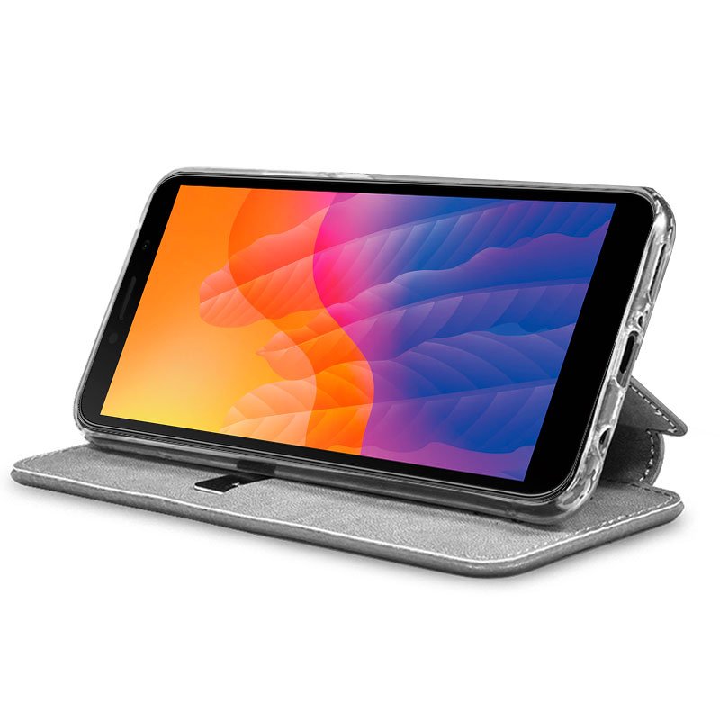 Tampa flip para tipo de livro de abertura lateral Huawei Y5p. O estojo incorpora uma caixa na qual o móvel está instalado, sendo perfeitamente fixo.