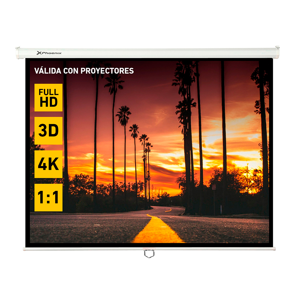 Pantalla de proyección manual plegable de 2 x 2 metros y 112″ blanco mate con cajetín de acero ideal para cine en casa, aulas de colegios, salas de conferencias, etc. Esta pantalla de proyección se despliega fácilmente con solo tirar de la anilla pudiéndolas parar donde quieras y adaptarlas así al formato que te interese 1:1, 4:3 y 16:9.